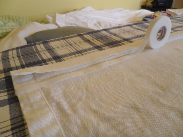 Now, once I had the crisp edge, I pulled out some iron-on hemming tape , pressed it underneath the hem (making a hemming tape sandwich with the fabric)....